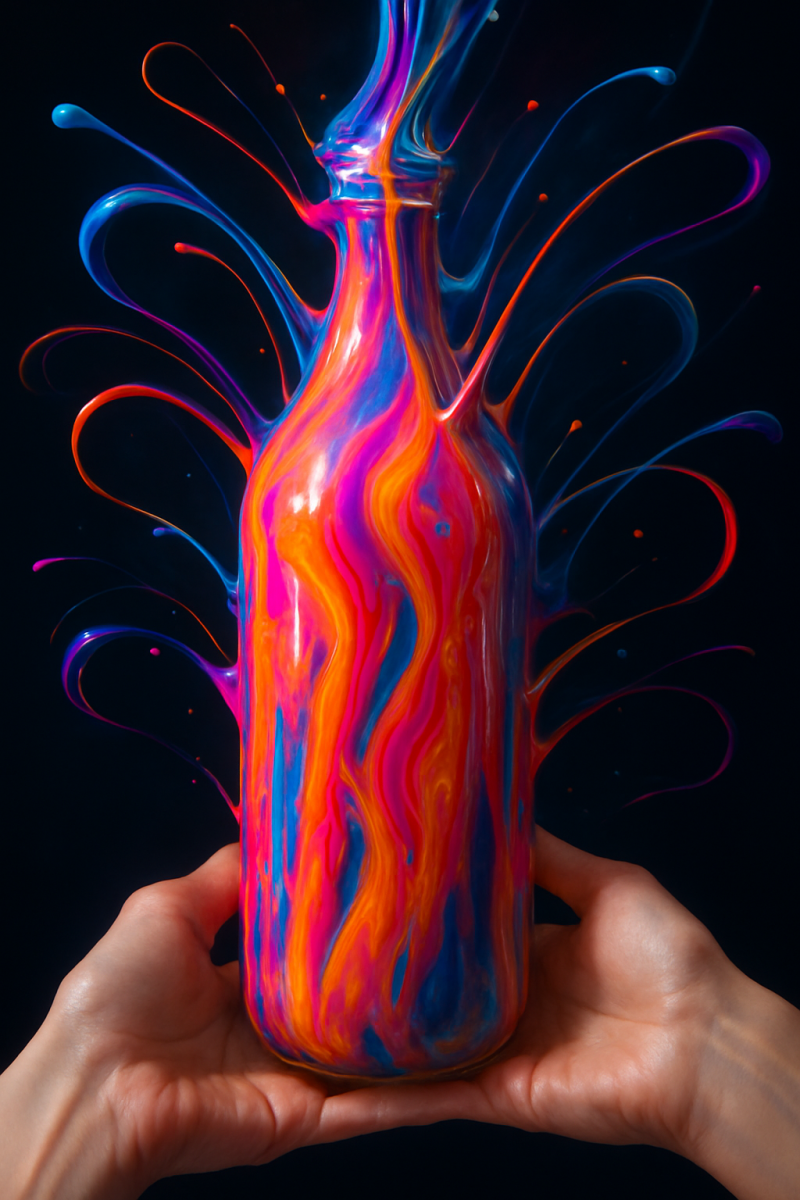 Jede Flasche erzählt ihre eigene Geschichte. Mit der Technik des Farbflusses entstehen einzigartige Kompositionen, die Licht und Emotionen einfangen – ein Stück Kunst für die Ewigkeit.